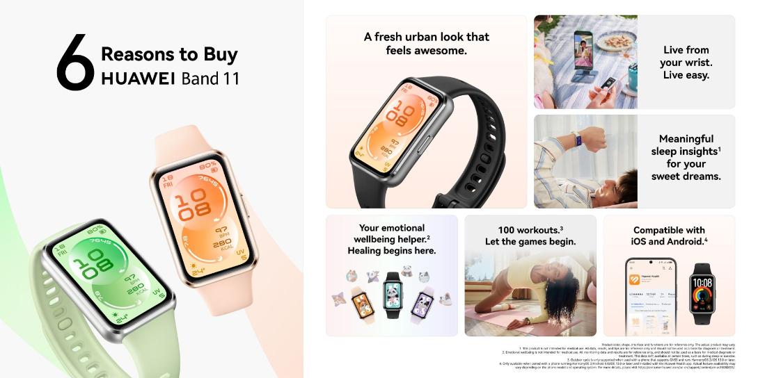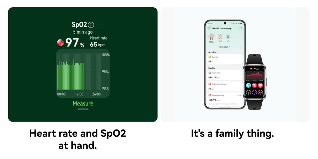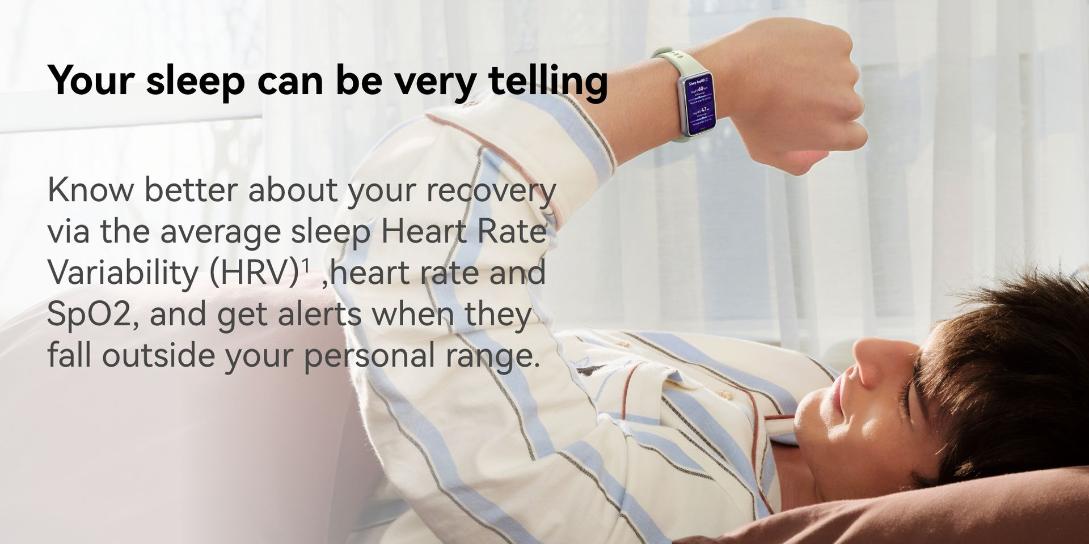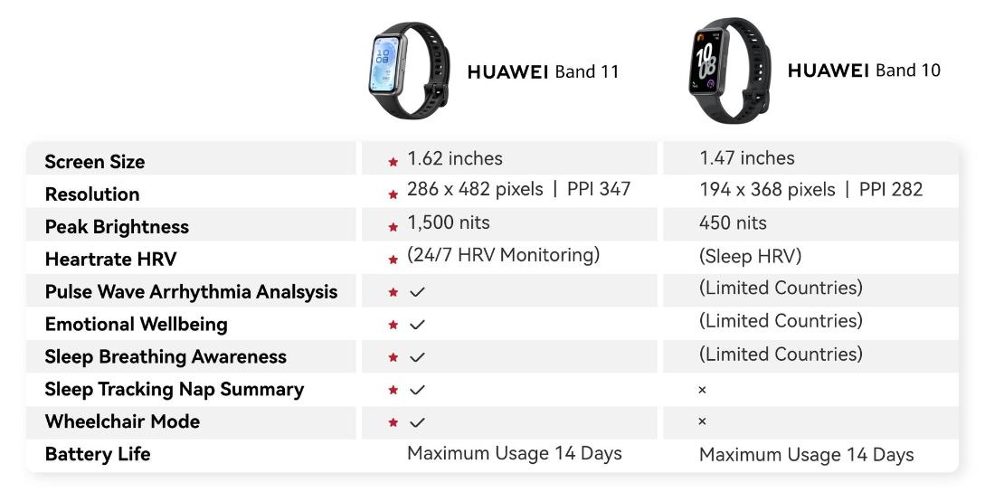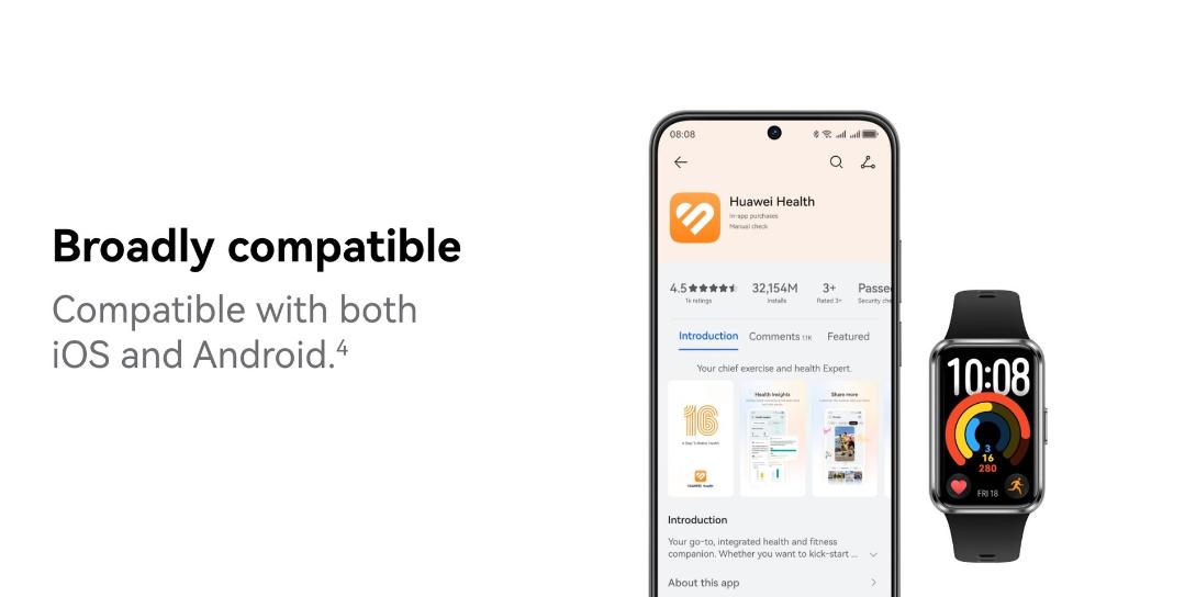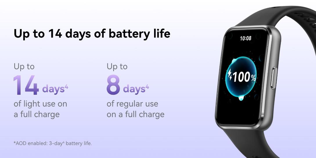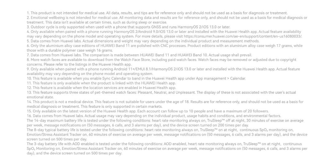 | Connectivity | The device can last for a maximum of 14 days. Heart rate monitoring is always on, HUAWEI TruSleep™ is off at night, 30 minutes of workouts per week, message notifications is on (including 50 messages, 6 calls, and 3 alarms per day), and screen turns on 200 times per day. The device can last for up to 8 days under typical usage. heart rate monitoring always on, TruSleep™ on at night, continuous SpO₂ Monitoring on, Emotion / Stress Assistant Tracker on, 60 minutes of exercise on average per week, message notifications on (50 messages, 6 calls, and 3 alarms per day), and the device screen turned on 500 times per day. The device can last for up to 3 days when AOD is on. AOD enabled, heart rate monitoring always on, TruSleep™ on at night, continuous SpO₂ Monitoring on, Emotion / Stress Assistant Tracker on, 60 minutes of exercise on average per week, message notifications on (50 messages, 6 calls, and 3 alarms per day), and the device screen turned on 500 times per day. *Data comes from HUAWEI labs. Actual usage may vary depending on the specific product, usage habits, and environmental factors. |